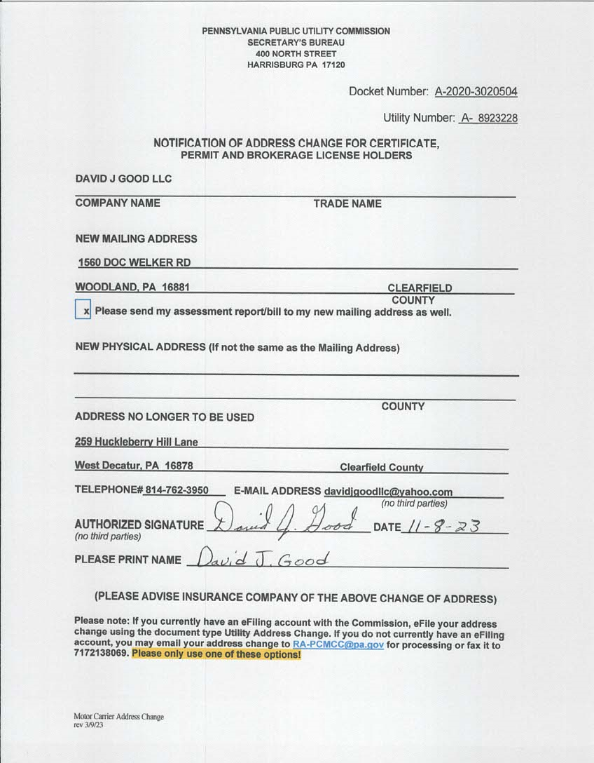 | ADDRESS UPDATE A-2020-3020504 DAVID J GOOD LLC.PNG | Address Change | 1916696 | 11/8/2023 | 11/14/2023 | A-2020-3020504 | |