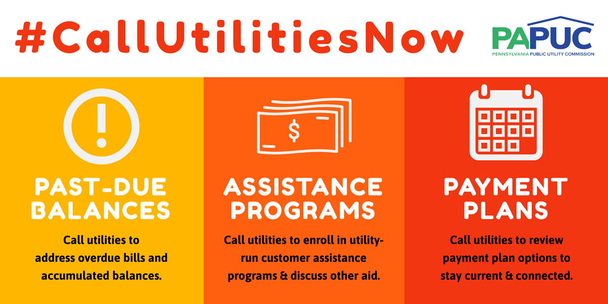 HARRISBURG – The Pennsylvania Public Utility Commission (PUC) today urged consumers and small businesses who are struggling financially to #CallUtilitiesNow to discuss the options available to address any past-due balances, apply for available assistance programs, and review payment plan options – all focused on keeping households and businesses connected to vital utility services.