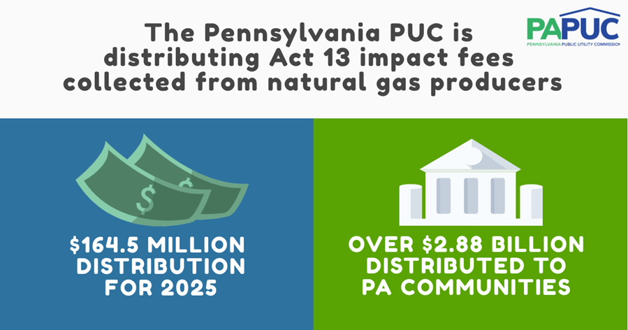 HARRISBURG – The Pennsylvania Public Utility Commission (PUC) today announced the distribution of $164,592,500 in natural gas impact fees collected from producers for the 2024 reporting year. This funding benefits counties, municipalities, and state programs under Act 13 of 2012, which established the unconventional gas well fee.