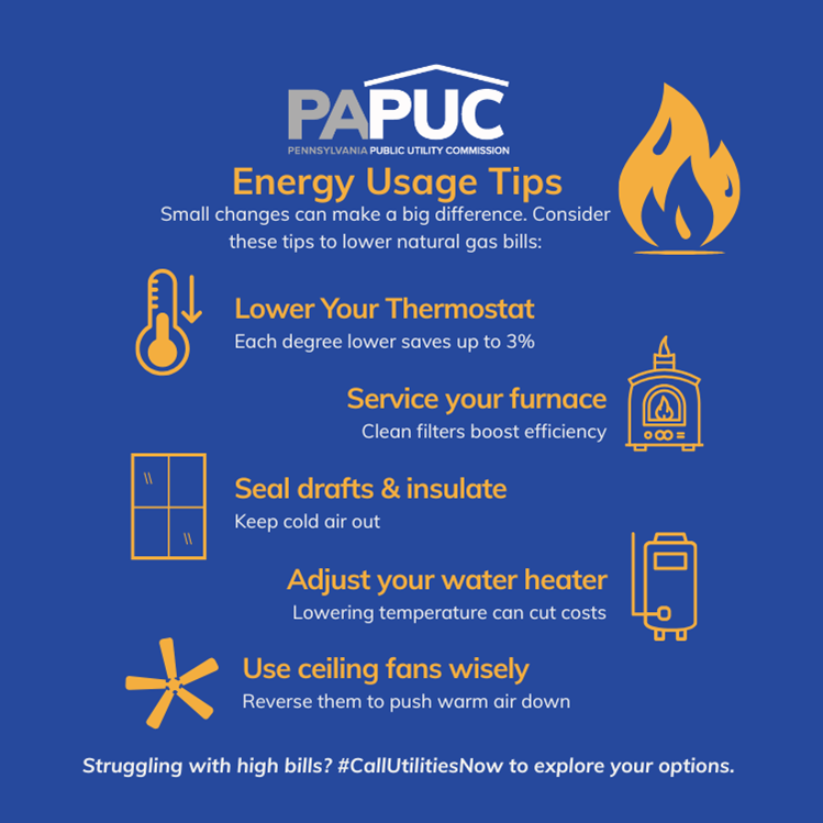 HARRISBURG – The Pennsylvania Public Utility Commission (PUC) is highlighting ways that natural gas customers can manage energy usage and costs this winter, while also encouraging struggling consumers to act early and #CallUtilitiesNow to discuss utility assistance programs and explore energy affordability options before winter bills rise.
